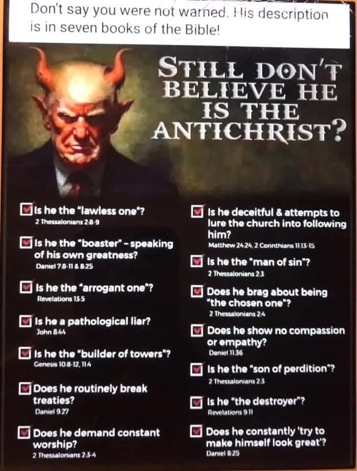 As you all know, I am a man of the cloth, an ordained minister, Universal life church of Modesto California. As such, I call upon you to join my in a prayer for the soul of the USA and that of our leader DJT. However, after a discussion many of my flock here and other fellow religious scholars at the local, we have determined DJT aka “the stinky dump,” has no soul to pray for. There fore, we have suggest someone prey on him. As such, I submit the following as scriptures proof that the anti christ now walks among us… Only prayer can save us now…prayer and money, make your donations today to “Old Hippie’s church for interesting women, Box 69 Dog Town California 94924. Every Dollar you send will go to the lord’s work in helping to end this terrible plight on humanity, thank you and may the creator bless you for just $5 more.